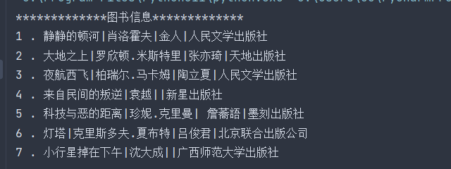 book_list = [['静静的顿河','肖洛霍夫','金人', '人民文学出版社'], ['大地之上','罗欣顿.米斯特里','张亦琦', '天地出版社'], ['夜航西飞', '柏瑞尔.马卡姆', '陶立夏', '人民文学出版社'], ['来自民间的叛逆', '袁越', '','新星出版社'], ['科技与恶的距离', '珍妮.克里曼', '詹蕎語', '墨刻出版社'], ['灯塔','克里斯多夫.夏布特','吕俊君','北京联合出版公司'], ['小行星掉在下午','沈大成', '', '广西师范大学出版社']] title='图书信息' print(title.center(30,'*')) i=0 while i <len(book_list): print(i+1,'.','|'.join(book_list[i])) i+=1