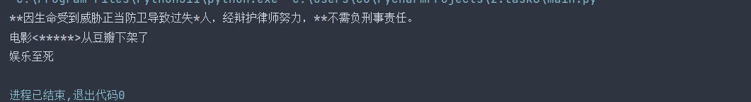 words_sensitive_list = ['张三', 'V字仇杀队', '杀'] comments_list = ['张三因生命受到威胁正当防卫导致过失杀人,经辩护律师努力,张三不需负刑事责任。', '电影<V字仇杀队>从豆瓣下架了', '娱乐至死'] t=0 while t < len(words_sensitive_list): i=0 while i < len(words_sensitive_list): comments_list[t]=comments_list[t].replace(words_sensitive_list[i],'*'*len(words_sensitive_list[i])) i+=1 t+=1 print('\n'.join(comments_list))