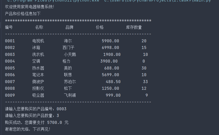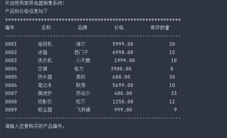print('欢迎使用家用电器销售系统!') print('产品和价格信息如下') print('***********************************************************') print('%-10s'%'编号','%-10s'%'名称','%-10s'%'品牌','%-10s'%'价格','%-10s'%'库存数量') print('-----------------------------------------------------------') pro = [['0001','电视机','海尔',5999.00,20], ['0002','冰箱','西门子',6998.00,15], ['0003','洗衣机','小天鹅',1999.00,10], ['0004','空调','格力',3900.00,0], ['0005','热水器','美的',688.00,30], ['0006','笔记本','联想',5699.00,10], ['0007','微波炉','苏泊尔',480.00,33], ['0008','投影仪','松下',1250.00,12], ['0009','吸尘器','飞利浦',999.00,9]] i=0 t=0 while i < len(pro): print('{:<10}'.format(pro[i][0]), '{:<10}'.format(pro[i][1]), '{:<10}'.format(pro[i][2]), '{:<10.2f}'.format(pro[i][3]), '{:>10}'.format(pro[i][4])) i+=1 print('-----------------------------------------------------------') pro_id=int(input('请输入您要购买的产品编号:')) count=int(input('请输入您要购买的产品数量:')) product_index=pro_id-1 product=pro[product_index] print('购买成功,您需要支付',product[3]*count,'元') print('谢谢您的光临,下次再见!')