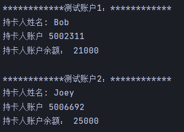 class Account: def __init__(self,name,account_number,initial_amount=10): self._name=name self._card_no=account_number self._balance=initial_amount def deposit(self,account): self._balance+=account def withdraw(self,amount): if self._balance < amount: print('余额不足') return self._balance-=amount def info(self): print('持卡人姓名:',self._name) print('持卡人账户',self._card_no) print('持卡人账户余额:',self._balance) def get_balance(self): return self._balance def main(): print('测试账户1:'.center(30,'*')) a1=Account('Bob','5002311',20000) a1.deposit(5000) a1.withdraw(4000) a1.info() print() print('测试账户2:'.center(30, '*')) a2 = Account('Joey', '5006692', 20000) a2.deposit(10000) a2.withdraw(5000) a2.info() if __name__ == '__main__': main()