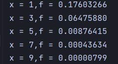 from math import * def func(x,m=0,s=2): y=(1/(s*((2*pi)**0.5)))*exp(-0.5*(((x-m)/s)**2)) return y for i in range(1,10,2): print(f'x = {i},f = {func(i):