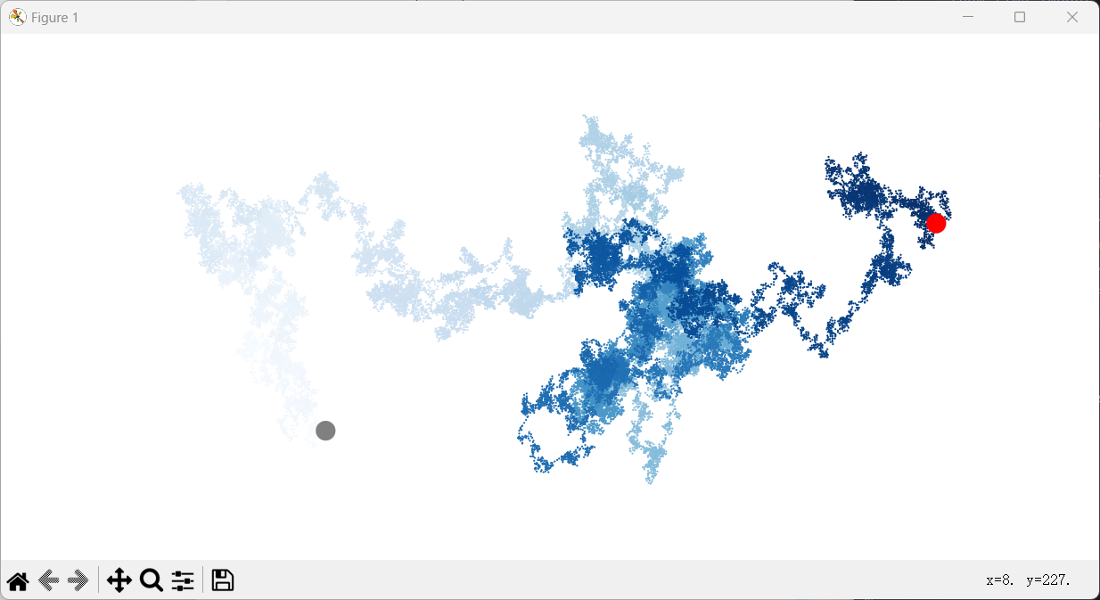 from matplotlib import pyplot as plt from random_walk import RandomWalk from time import sleep n = 0 while n < 2: n += 1 rw = RandomWalk(50000) rw.fill_walk() plt.figure(figsize = (10, 6), dpi = 128) point_numbers = list(range(rw.num_points)) plt.scatter(rw.x_values, rw.y_values, c=point_numbers,cmap=plt.cm.Blues,edgecolor='none',s=1) plt.scatter(0, 0, c = 'grey', edgecolors='none', s=100) plt.scatter(rw.x_values[-1], rw.y_values[-1],c = 'red',edgecolors='none',s=100) plt.axis('off') plt.show()
