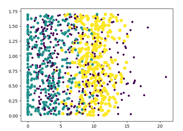 1 from numpy import * 2 import matplotlib 3 import matplotlib.pyplot as plt 4 5 def file2matrix(filename): 6 fr=open(filename) 7 arrayOLines=fr.readlines()#读取文件 8 numberOFLines=len(arrayOLines)#文件行数 9 returnMat=zeros((numberOFLines,3))#文件行数*3的矩阵 10 classLabelVector=[] 11 index=0 12 for line in arrayOLines: 13 line=line.strip()#截掉回车符 14 listFormLine=line.split('\t')#按照制表符划分 15 returnMat[index,:]=listFormLine[0:3]#取每行的前三个元素 16 classLabelVector.append(int(listFormLine[-1]))#最后一个元素作为标签 17 index+=1 18 return returnMat,classLabelVector 19 20 datingDataMat,datingLabels=file2matrix('datingTestSet2.txt') 21 fig=plt.figure()#Figure实例 22 ax=fig.add_subplot(111)#绘制子图,三个参数分别表示子图总行数,总列数以及子图位置,本例只画了一个。 23 ax.scatter(datingDataMat[:,1],datingDataMat[:,2],15.0*array(datingLabels),15.0*array(datingLabels))#画散点图,利用第二列及第三列数据。 24 plt.show()
