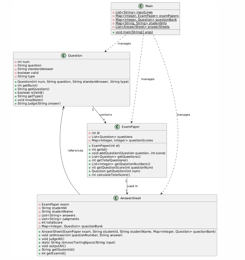 AnswerSheet 类处理学生的答卷信息,包括记录答案、判分、输出结果等。