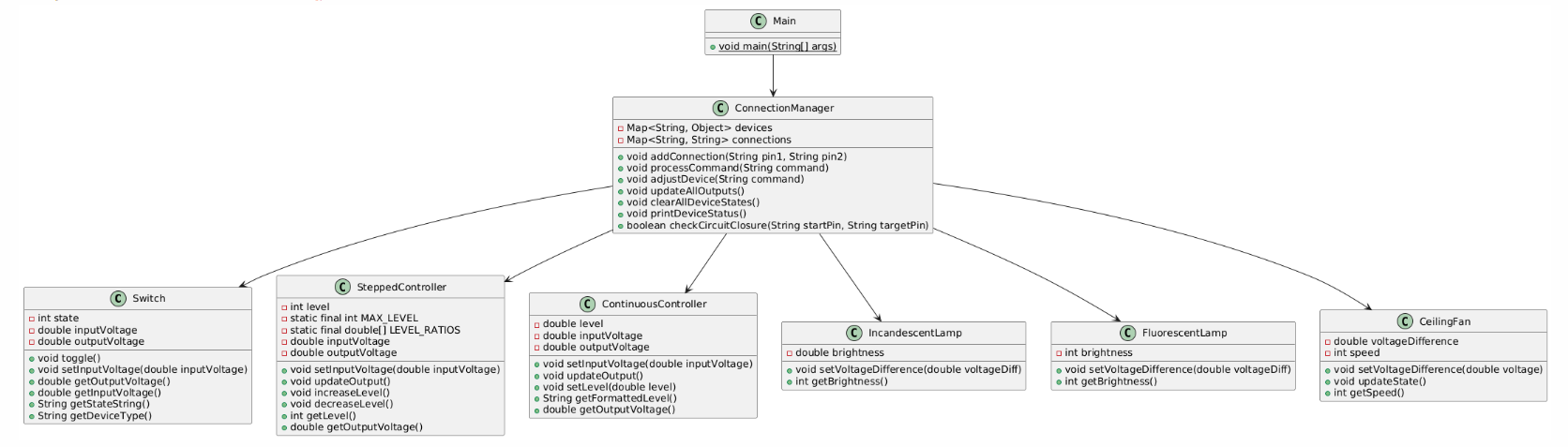 public static void main(String[] args)主程序入口。创建 ConnectionManager 对象。从标准输入读取命令,直到输入 "end"。处理所有命令。初始化串联电路的设备列表。查找主电路。检查主电路的连通性.如果连通,计算总电阻、总电流,并计算各设备的电压。打印所有设备的状态。