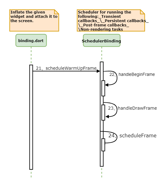 再次进行级联调用scheduleWarmUpFrame,这里用来调度预热帧,执行帧绘制方法handleBeginFrame和handleDrawFrame。此时会触发布局渲染工作。