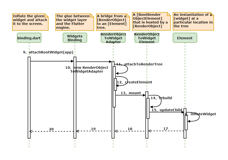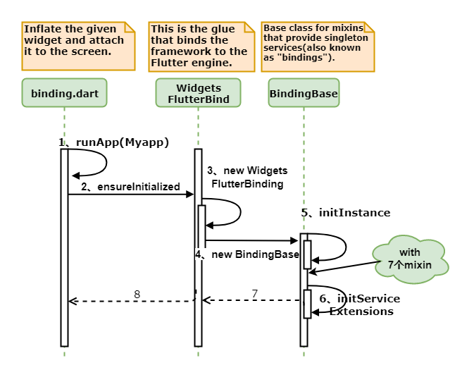 WidgetsFlutterBinding初始化操作:这是一个单例模式,负责创建WidgetsFlutterBinding对象,这个对象继承抽象类BindingBase,并且附带7个mixin Binding,初始化渲染、语义化、绘制、平台消息以及手势等一系列操作;我理解这里就是做了全局调用的准备性工作,此时在还不会被触发。我们先看一下这个时序图,先有个整体概念。