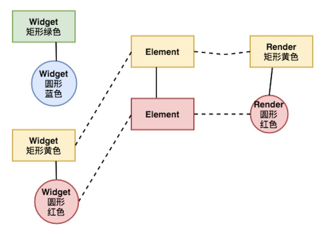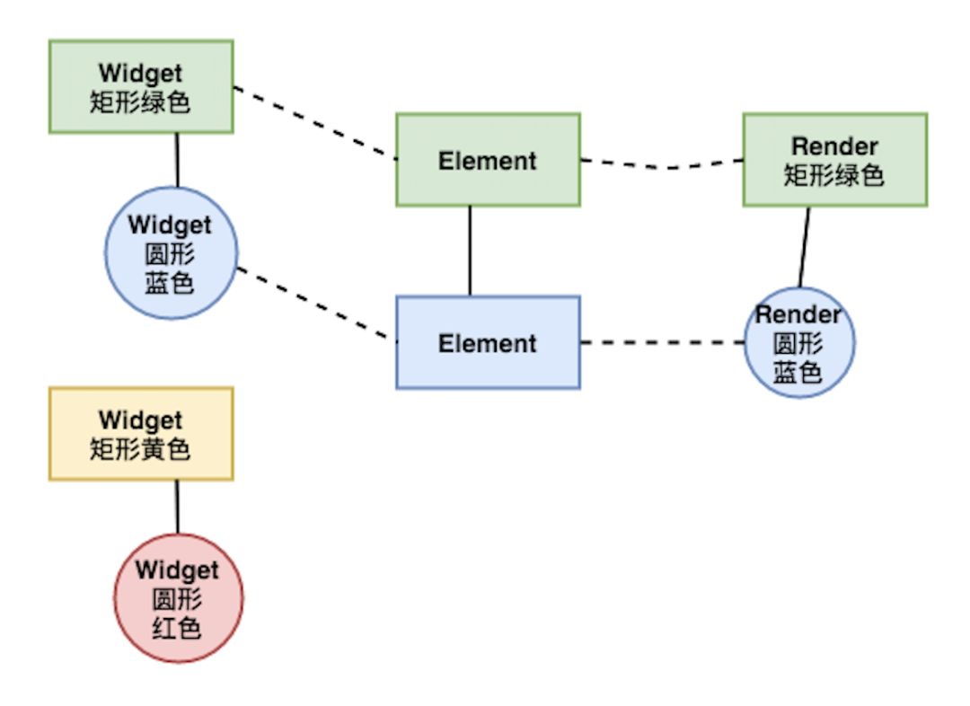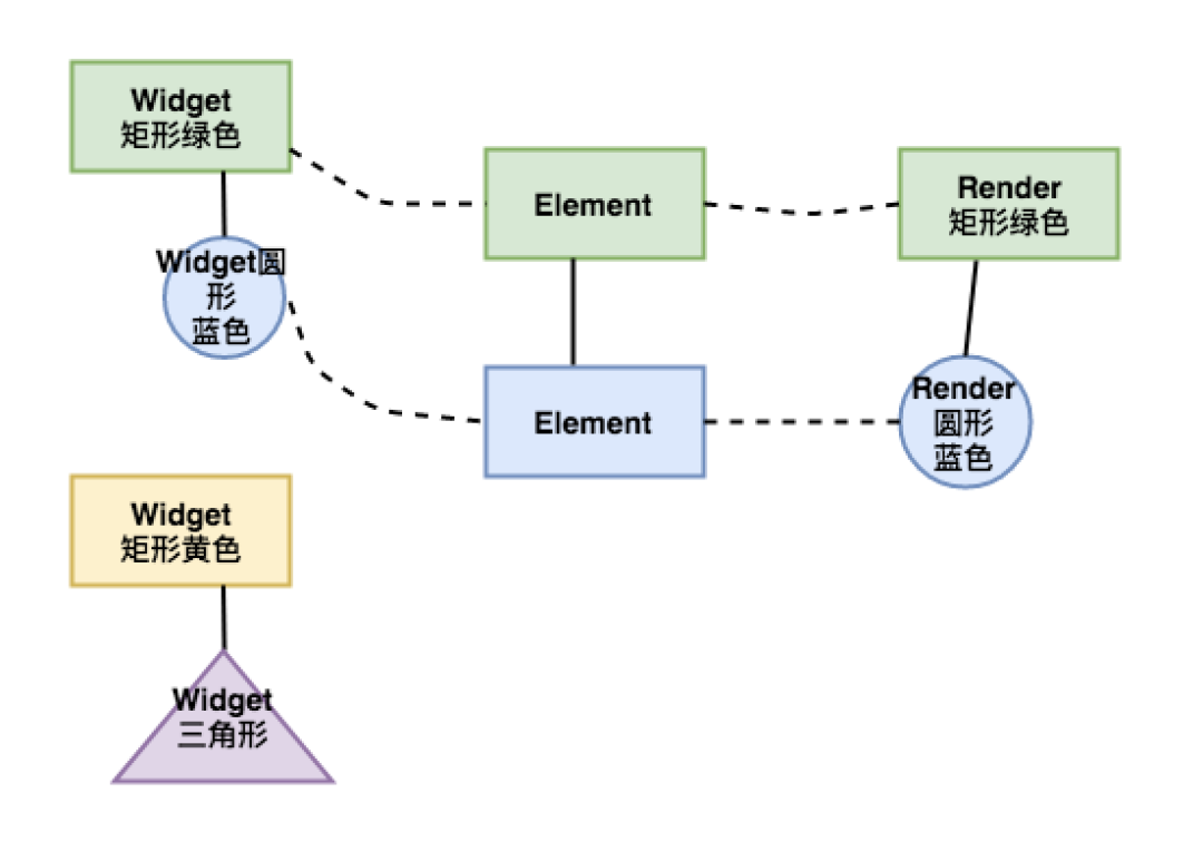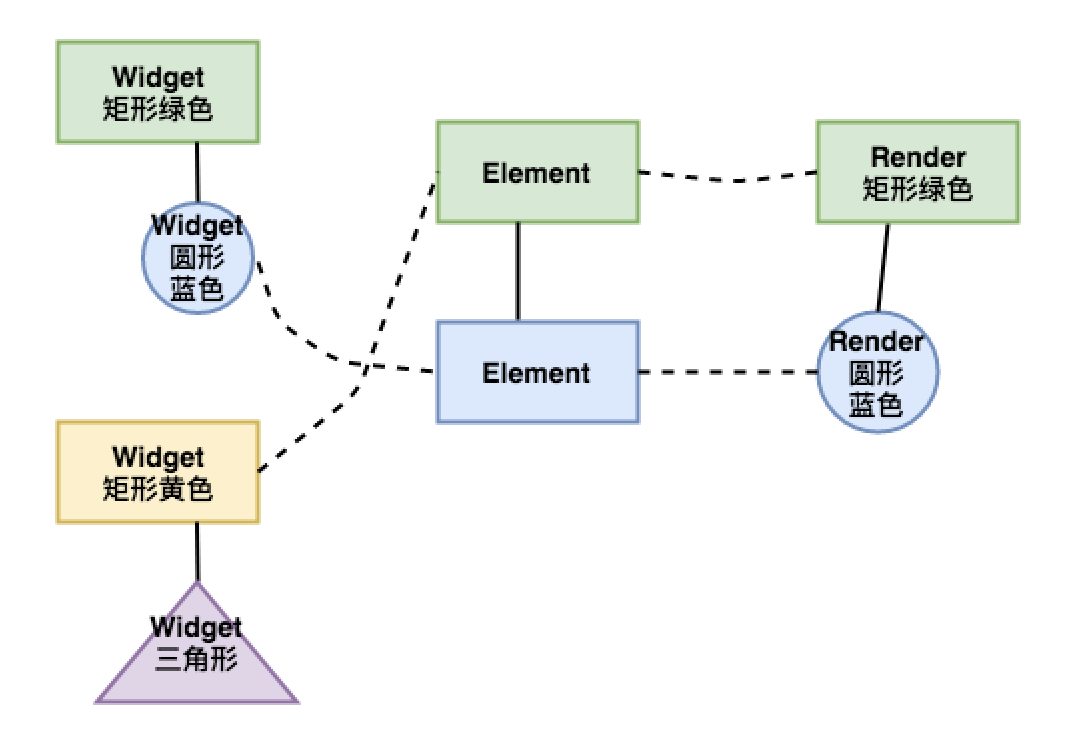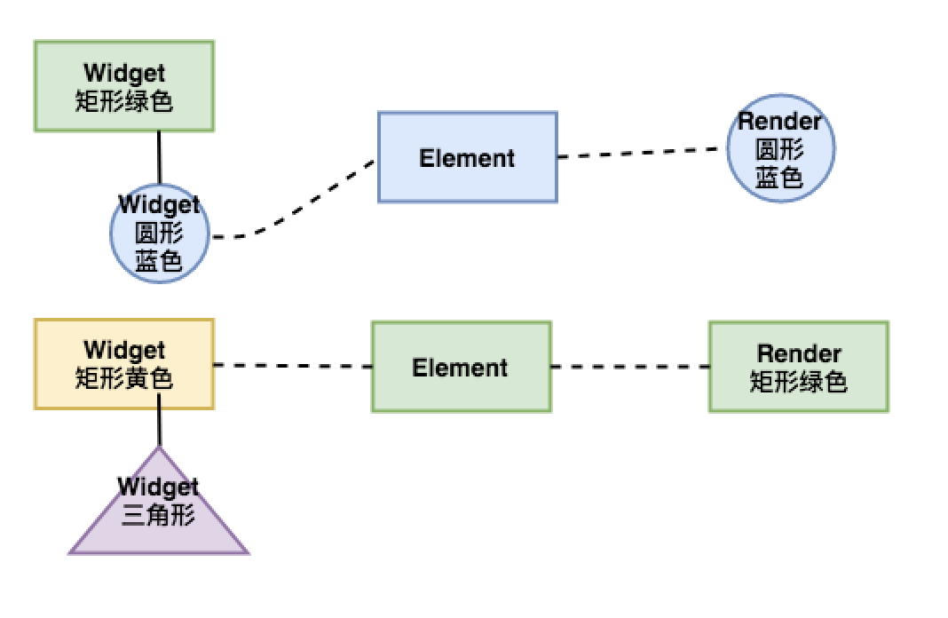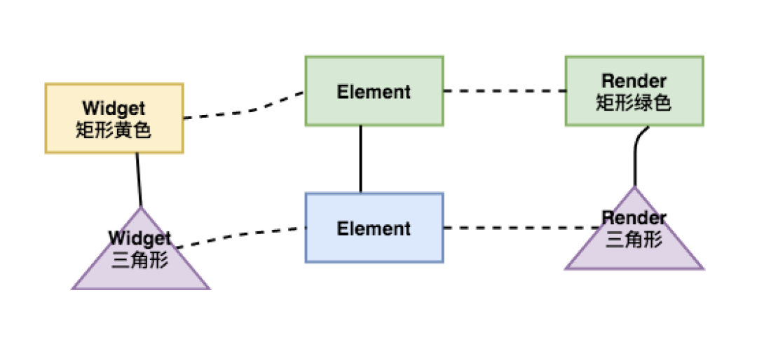 第一次完成布局后,看到是对应关系如上虚线部分。当黄色矩形发生颜色变化时,它并没有新建 Element,而是复用了之前矩形 的 Element,由于矩形并没有改变 Widget 类型,所以 Element 只需要根据新的 Widget 修改自身的颜色配置参数作为新的 Widget 距可以了。正是通过这种可变与不可变对象的组合,使得Flutter布局模式灵活而又高效。