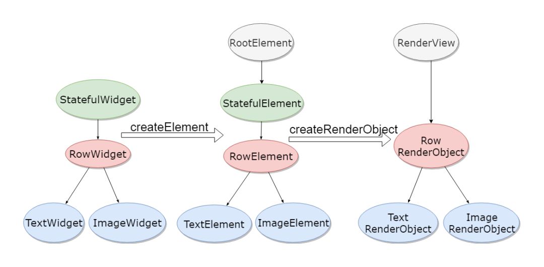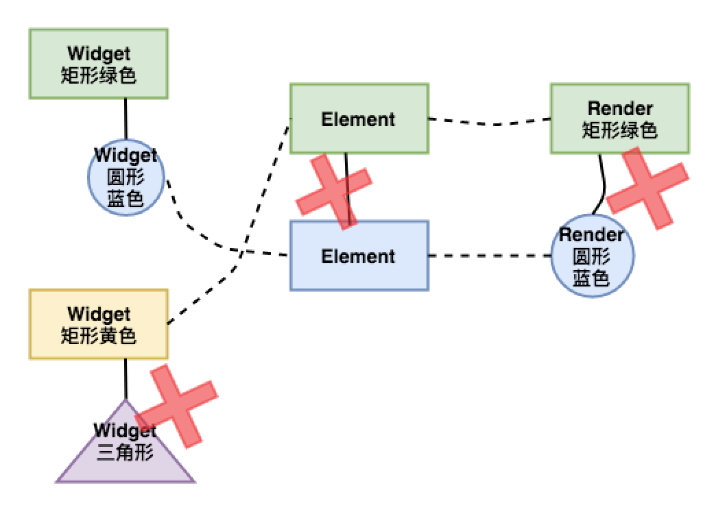 三角形红色Widget类型发生了变化,就不可以复用 由 矩形绿色 类型创建的 Element 与 RenderObject,那怎么办呢?