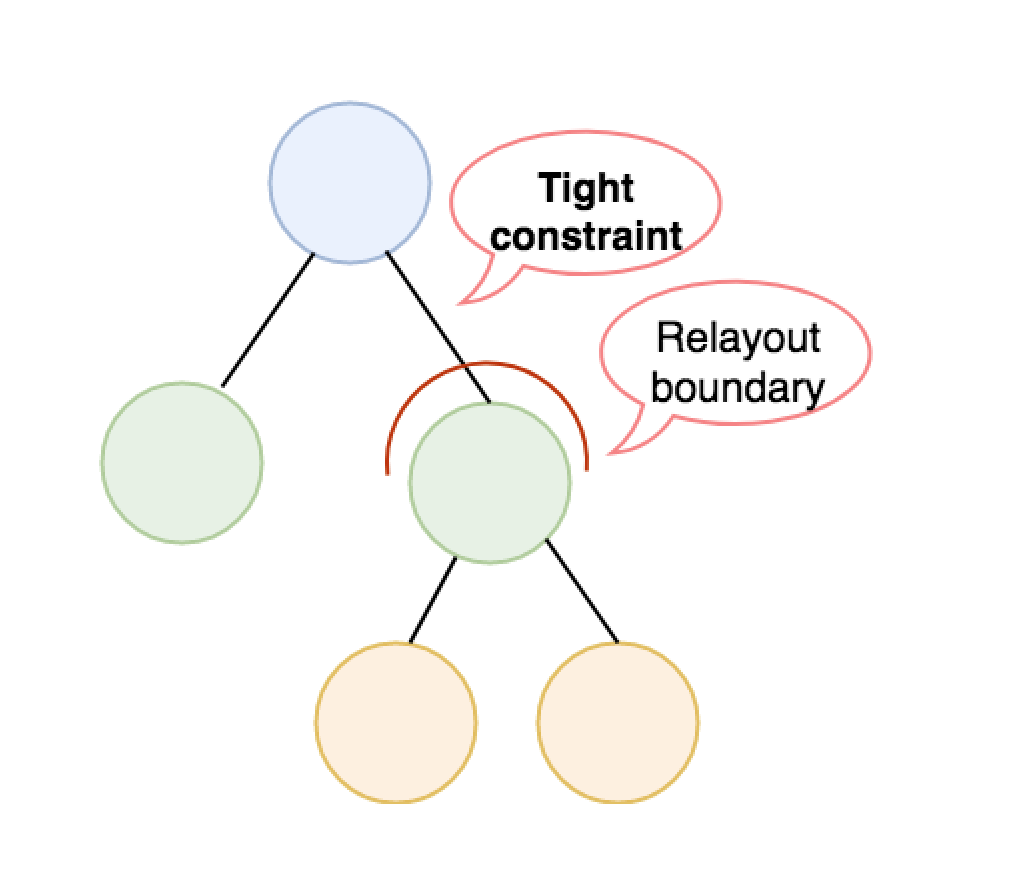 如图满足constraints.isTight 父对象对子孩子的大小有严格限定,红色的弧线部分,此时子对象自动被设置隔离带布局边界,子树的重布局不会扩散到父级。可以说这也是提高性能的好办法。