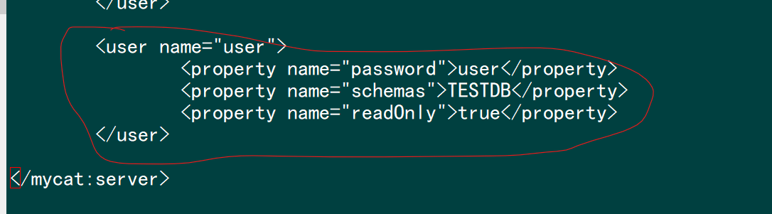 继续修改/root/mycat/conf/server.xml 文件,删除末尾这五行