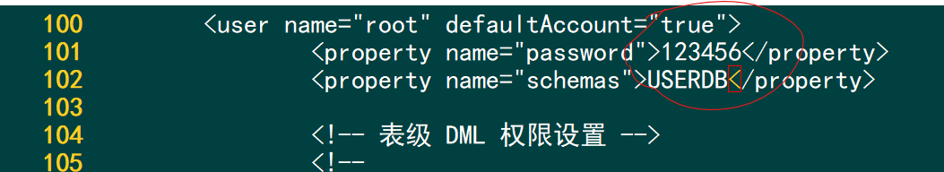 <schema name="USERDB" checkSQLschema="true" sqlMaxLimit="100" dataNode="dn1"></schema>