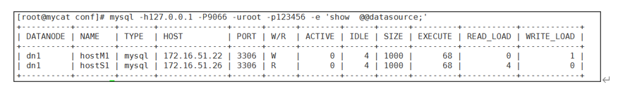 mysql -h127.0.0.1 -P9066 -uroot -p123456 -e 'show @@datasource;'