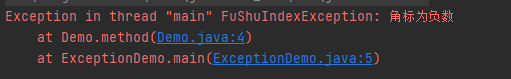 public class FuShuIndexException extends Exception{ FuShuIndexException(){ } FuShuIndexException(String msg){ super(msg); //交给Exception类完成抛出信息 } } public class Demo { public int method(int[] arr,int index) throws FuShuIndexException { //对异常进行声明 if(index<0){ throw new FuShuIndexException("角标为负数"); } return arr[index]; } } public class ExceptionDemo { public static void main(String[] args) throws FuShuIndexException{ //对异常进行声明 int []arr = new int[3]; Demo d = new Demo(); int num = d.method(arr,-3); System.out.println(num); } }