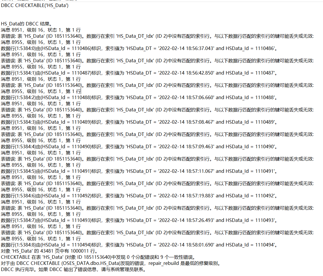 提示“HS_Data”表有9个一致性错误:数据行在索引 'HS_Data_DT_Idx' (ID 2)中没有匹配的索引行。需要修复“HS_Data”表的“HS_Data_DT_Idx”索引的一致性错误。