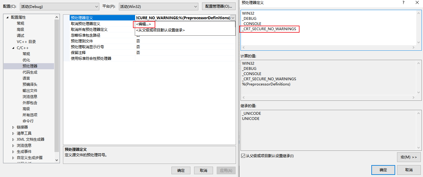 ---【项目】->【项目属性】,点击【C/C++】里的【预处理器】,对【预处理器定义】进行编辑,加入一段代码:_CRT_SECURE_NO_WARNINGS