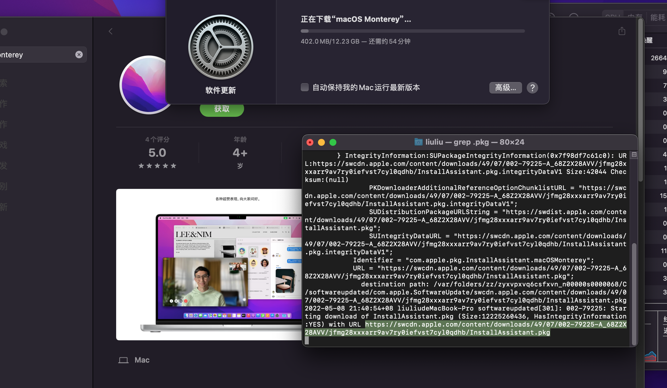 tail -f /var/log/install.log | grep .pkg 2、打开App Store,输入macOS(系统名字)