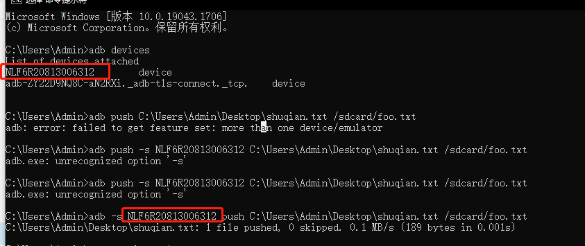 执行adb push或者adb pull的时候也应该在adb后面加上-s 设备序列号