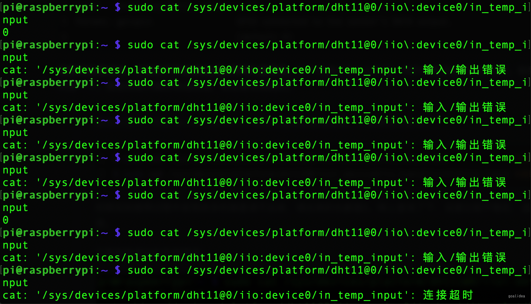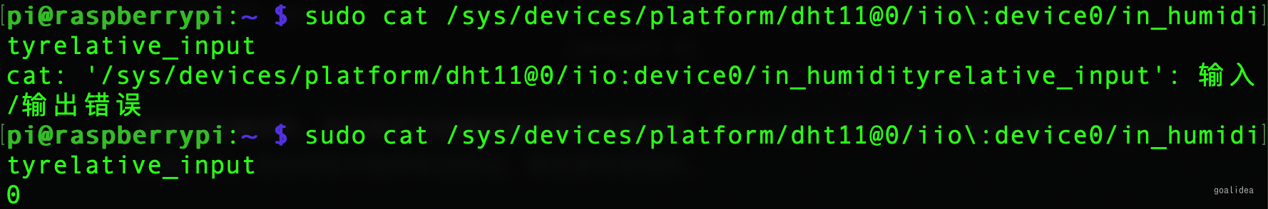 dtoverlay=dht11就可以直接读取温湿度,不需要自己实现了:$ sudo cat /sys/devices/platform/dht11@0/iio\:device0/in_temp_input #读取温度 $ sudo cat /sys/devices/platform/dht11@0/iio\:device0/in_humidityrelative_input #读取湿度但我实际使用过程中发现很多时候是读不出来,读出来的也都是0。网上查询了下,说是比较不稳定,遇到系统采样就读取错误。