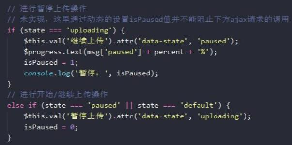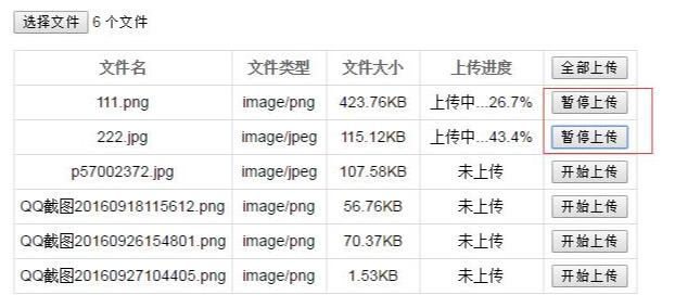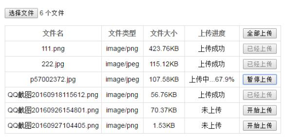 这个例子实现了文件断点续传的基本功能,不过手动的“暂停上传”操作还未实现成功,可以在上传过程中刷新页面来模拟上传的中断,体验“断点续传”、