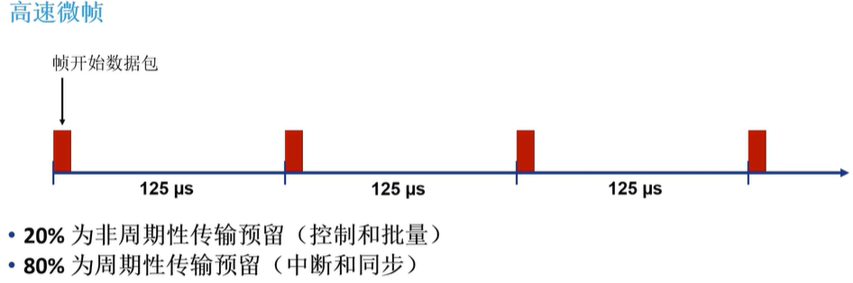 - 高速USB设备使用更复杂的帧结构。高速USB总线在一个微帧(microframe)的基础上组织其活动,而1个帧周期包含8个连续的微帧,即每个微帧持续时间为125微秒(μs)。