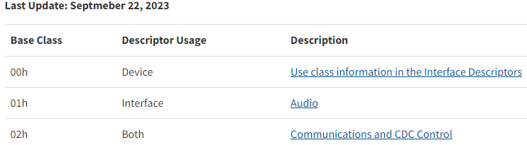 接口描述符中的class指定了该接口是什么类型设备,比如音频、打印机等,在 https://www.usb.org/defined-class-codes 有列出已定义的class码