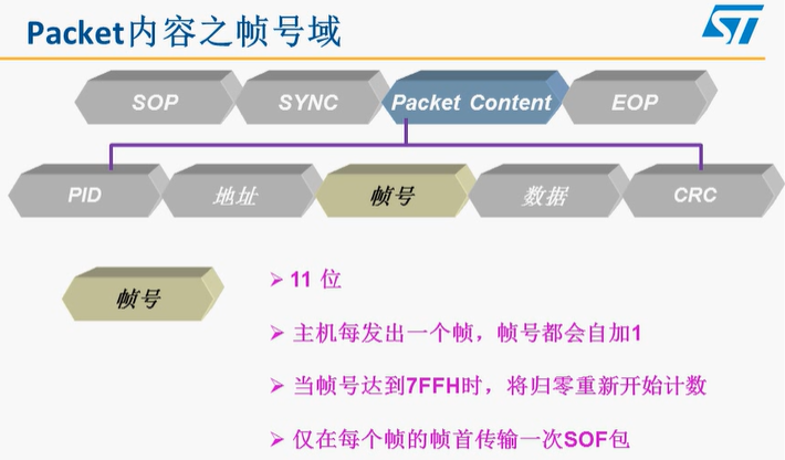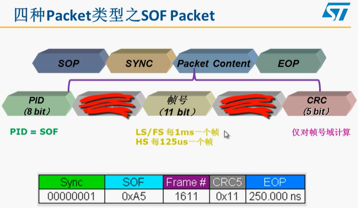 - 每个帧周期以一个Start Of Frame (SOF) 包开始,它包含了帧号,用于同步目的,并标志着新一帧数据传输的开始。
