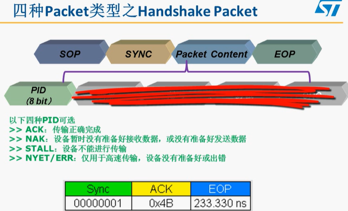 主机和设备都可以用ACK来确认,而NAK、STALL、NYET只有设备能够返回,主机不能使用这些握手包。