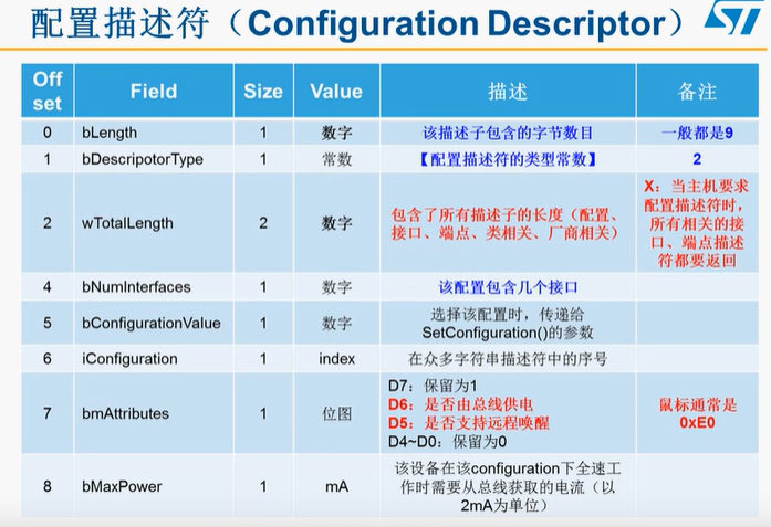 每一个USB设备至少有一个或者多个配置描述符,但是主机同一时间只能选择某一种配置,标准配置描述符主要向主机描述当前配置下的设备属性、所需电流、支持的接口数、配置描述符集合长度等等;