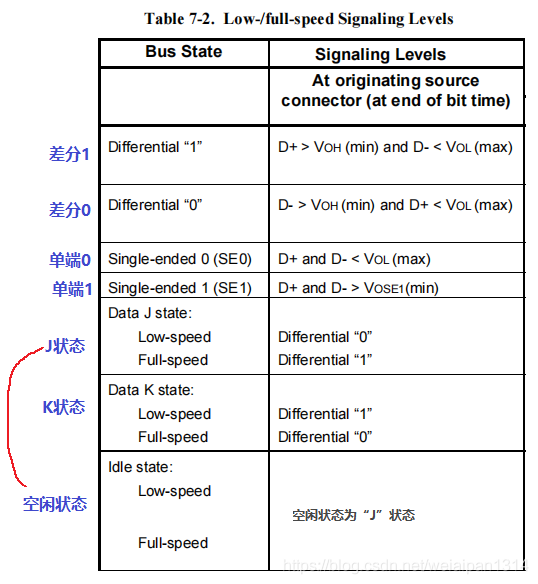 J状态和空闲状态的总线电压一样,不过空闲状态的高电平是上拉电阻控制的,J状态是主机或设备控制的。