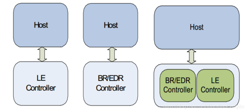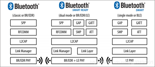 从左到右依次为:经典蓝牙(BR/EDR)、双模蓝牙(同时支持BR/EDR/LE)和低功耗蓝牙(BLE)。其中经典蓝牙和低功耗蓝牙互不兼容。
