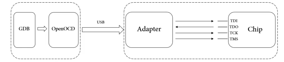 在电脑端,我们需要先运行 Openocd 充当调试代理用于与目标硬件进行直接通讯,他提供一个 GDB 服务器接口(通常在TCP端口 :3333 上),GDB 可以通过该接口与 OpenOCD 通信。 GDB 会向 OpenOCD 发送调试命令,例如设置断点、查看寄存器、单步执行等。当 OpenOCD 接收到来自 GDB 的命令后,负责将这些命令转换成特定的硬件指令,并执行到目标设备上。