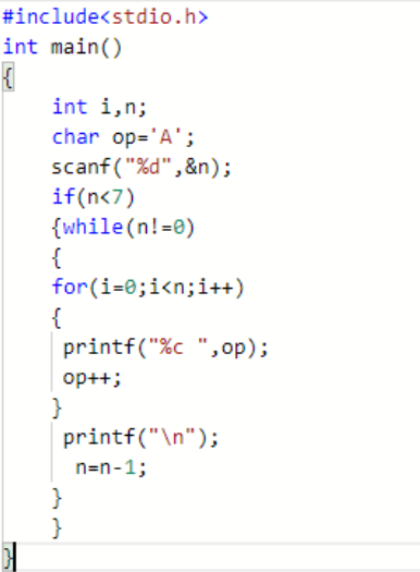 1.1 题目:本题要求编写程序,输出n行由大写字母A开始构成的三角形字符阵列。