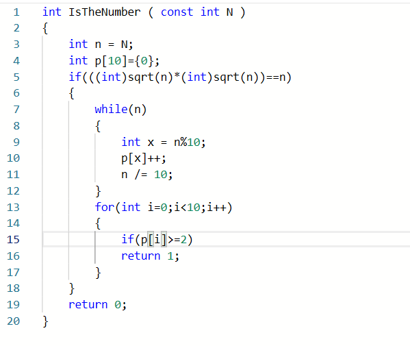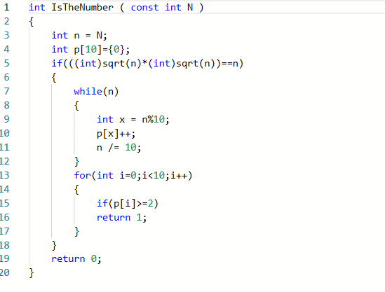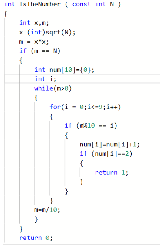 1.1 题目:本题要求实现一个函数,判断任一给定整数N是否满足条件:它是完全平方数,又至少有两位数字相同,如144、676等。int IsTheNumber ( const int N );