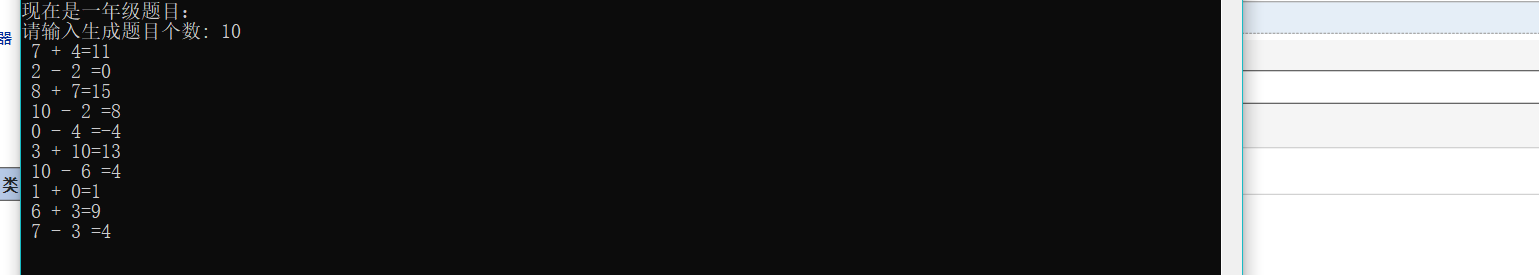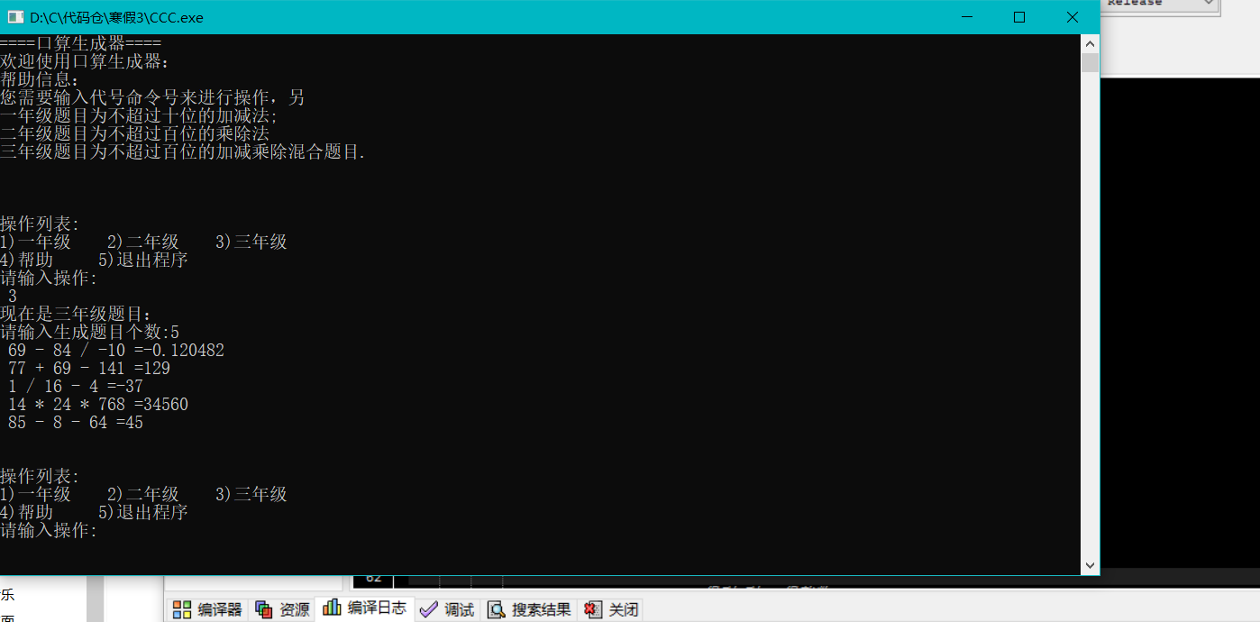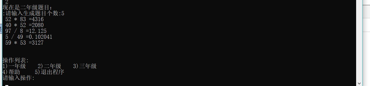 s2=rand()%101;s3=rand()%100+1; /*得到1到100得整数*/ a= rand() % 2; if(a==1) printf(" %.f * %.f =%g \n", s1,s2,s1*s2); else printf(" %.f / %.f =%g \n", s1,s2,s1/s2); } break; case 3: printf("现在是三年级题目:\n"); printf("请输入生成题目个数:"); scanf("%d",&number); for(i=1;i<=number;i++) { s1=rand()%101; s2=rand()%100+1; a=rand()%4; switch(a) { case 0: c1='+';s3=s1+s2;break; case 1: c1='-';s3=s1-s2;break; case 2: c1='*';s3=s1*s2;break; case 3: c1='/';s3=s1/s2;break; } s1=rand()%101; s4=rand()%100+1; b=rand()%4; switch(b) { case 0: c2='+';s5=s3+s4;break; case 1: c2='-';s5=s3-s4;break; case 2: c2='*';s5=s3*s4;break; case 3: c2='/';s5=s3/s4;break; } printf(" %.f %c %.f %c %.f =%g \n",s1,c1,s2,c2,s3,s5 ); } break; case 4: help(a); break; case 5: printf("退出程序。。。。。"); break; default: printf("Error!!!\n错误操作指令, 请重新输入\n\n\n"); }}