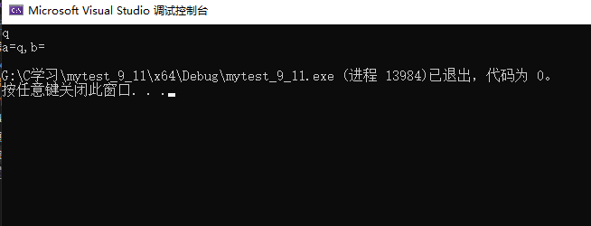 a=q,b=10------b=10ascii码值是换行符'\n',scanf缓冲区(q+回车键(\0)),