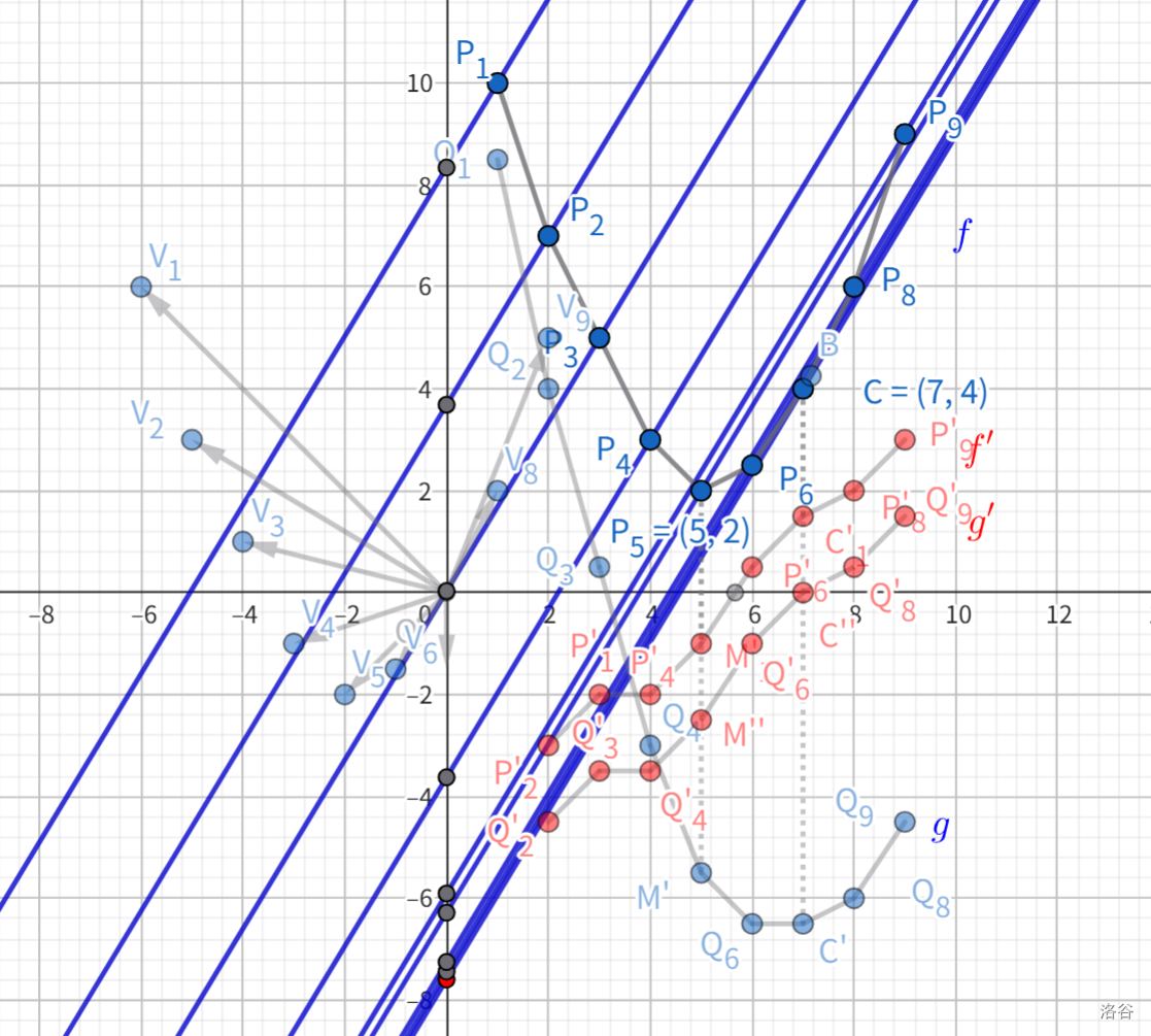 记垂直向上平移了 \(k\) 个单位长度,那么有 \(g'(i) = f'(i)+k\),容易想到 \(g(i) = f(i) + ki\) 是一个可能的构造。并且由于 \(g'\) 有 \(f'\) 平移得到,仍为增函数,所以这个 \(g\) 仍具有凸性!凸性是非常好的性质,加上 \(g(i) = f(i) + ki\) 的形式非常简单,所以一般也可同 \(f\) 一样快速计算极值和极值极值点。