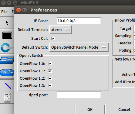 点击左上角的 Edit,进行全局设置,此时在默认设置的基础上,勾选“Start CLI”,将 OpenFlow 1.1 1.2 1.3 全部勾选。