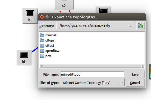 拓扑生成并确认无误之后,可以点击 miniedit 左上角的 File 菜单,选择 Export Level 2 Script,将拓扑保存为 Python 脚本,方便之后执行脚本一键生成。