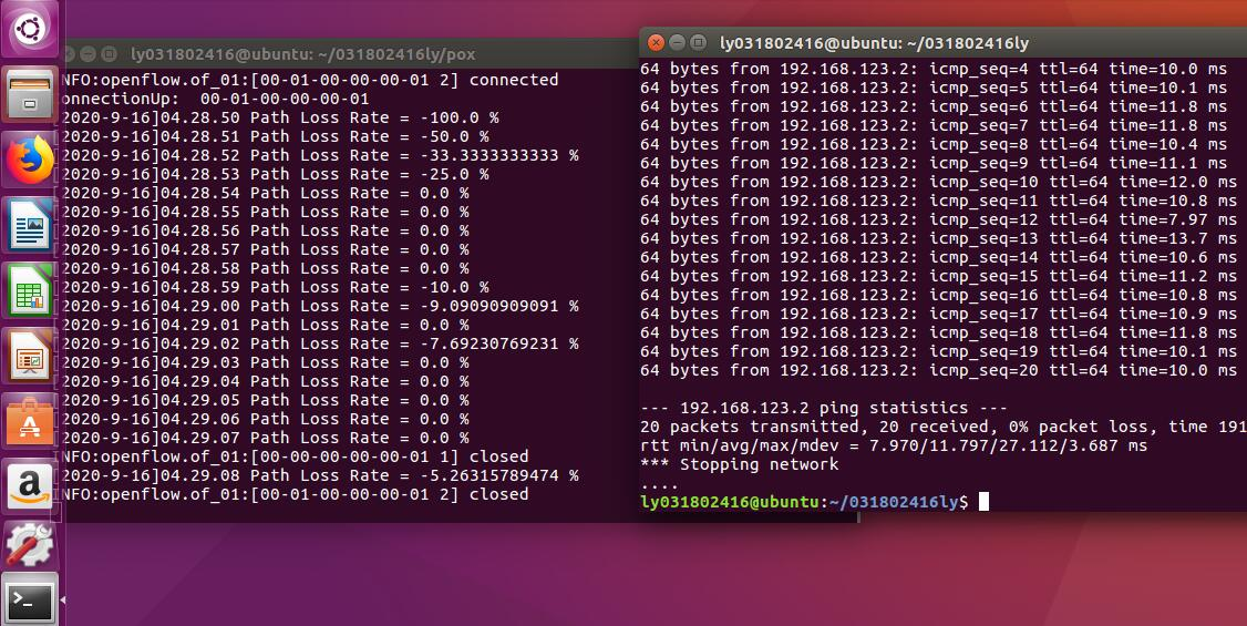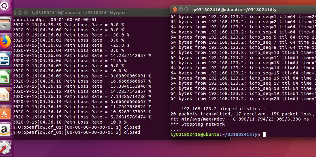 在实验 2 的基础上进一步熟悉 Mininet 自定义拓扑脚本,以及与损耗率相关的设定;初步了解 Mininet 安装时自带的 POX 控制器脚本编写,测试路径损耗率。