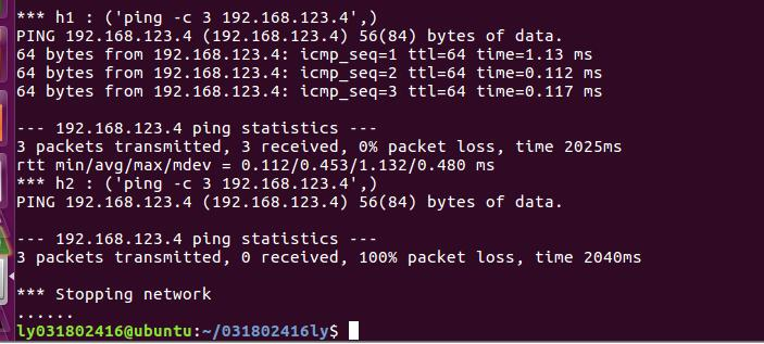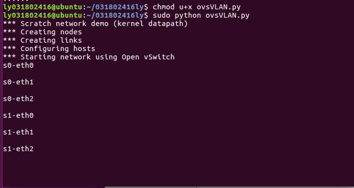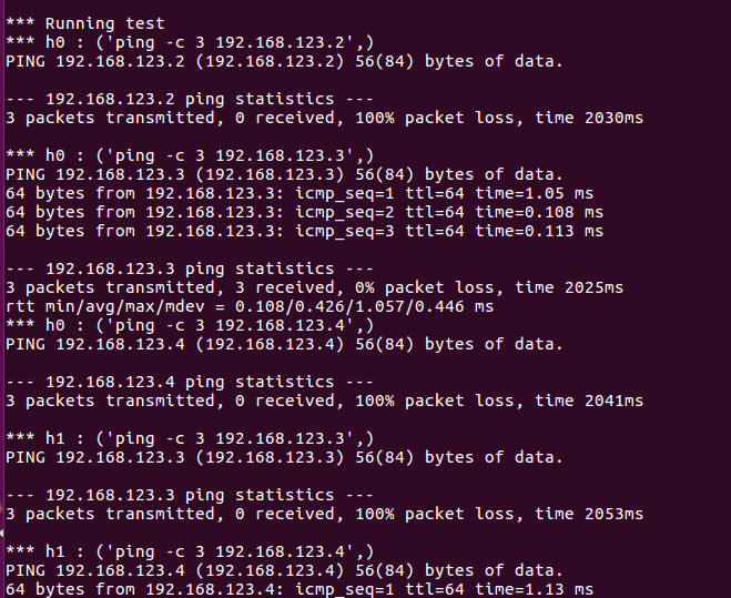 上述代码将 h0 和 h2 划分在 VLAN 0 中,h1 和 h3 划分在 VLAN 1 中,由于拓扑没有控制器,并且初始化时删除了交换机中的所有流表,因此除非下发流表,否则主机之间网络无法连通。请尝试修改代码,利用 ovs 命令直接下发 VLAN 设置的流表项,最终测试 h0 和 h2 互通,h1 和 h3 互通,其余主机均不通,结果如下图。OVS 实现 VLAN 可参考博客:https://www.cnblogs.com/fjlinww/p/11791846.html