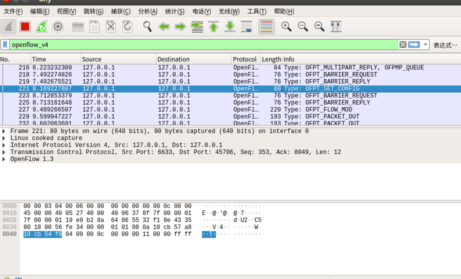 查看抓包结果,利用 openflow_v4 过滤出 OpenFlow 1.3 协议,可以看到 OpenFlow协议下,交换机和控制器的交互过程。