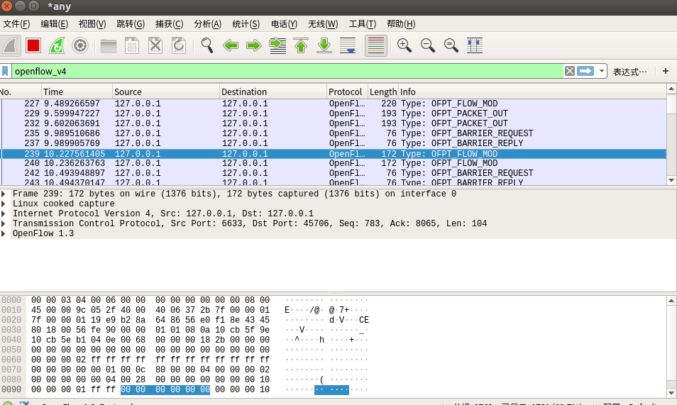 (3 )Wireshark 抓包分析 OpenFlow 1.3sudo wireshark 命令开启 wireshark,选择 any,抓取所有数据包。