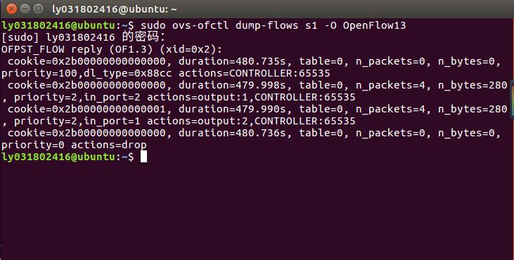 用 OVS 命令查看交换机中确实存在相应版本的流表,cookie、priority 等信息可以上面的抓包能够对应上。