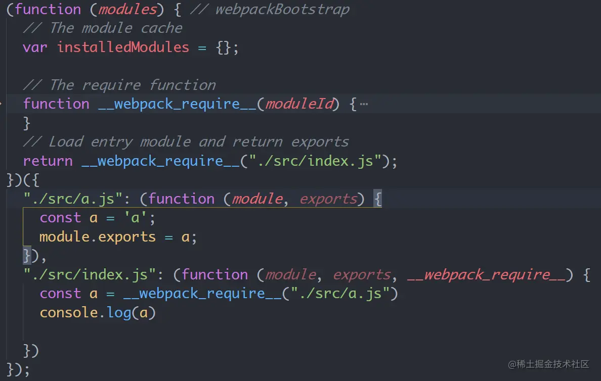 打包结果中删去了一些注释和暂时用不要的代码,可以很明显的看出来实现commonjs模块化的关键就是这个 __webpack_require__ 函数,通过传入模块id来得到模块的导出。