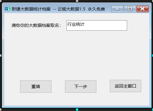 第一步: 打开“云瑜大数据1.5” 电脑版(你也可以用安卓手机版、苹果手机版), 新建一个大数据统计档案,给这个档案取个名字,我们这里取名:行业统计。然后点击下一步,在关键词界面里输入“商业行业统计”。