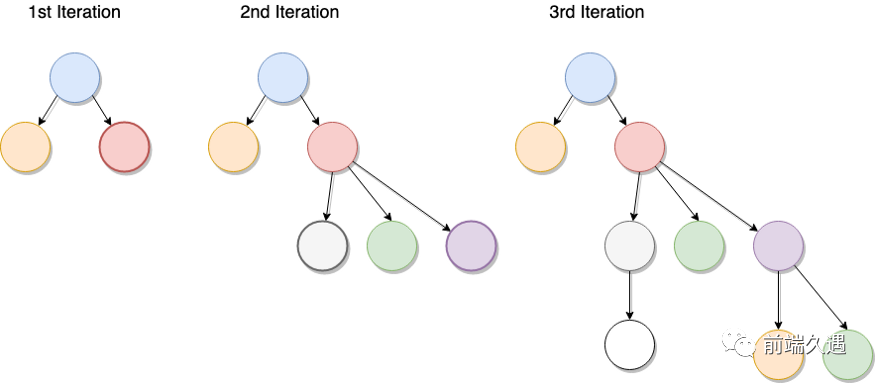 - 深度优先搜索(DFS):这是查找树的一种方式。它的工作方式是,首先先遍历整个左侧,然后回溯到最后访问的父级,然后移至右侧的子树。