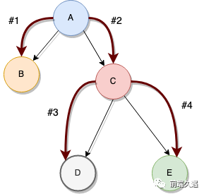 遍历结果:A-> B-> C-> D-> E。节点的顺序由DFS方法确定,也可以按相反的顺序遍历。