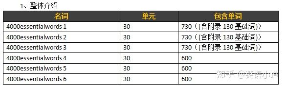 整套教材有6本书,包含4000 个使用频率最高的单词,每本书包含600个词,30个单元,每个单元20个单词,同时有整片文章针对这20个单词的运用和练习,是一套设计十分合理的英语书籍。