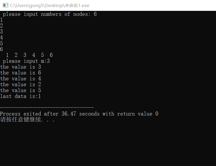 n个数据元素构成一个环,从环中任意位置开始计数,计到m将该元素从表中取出,重复上述过程,直至表中只剩下一个元素。